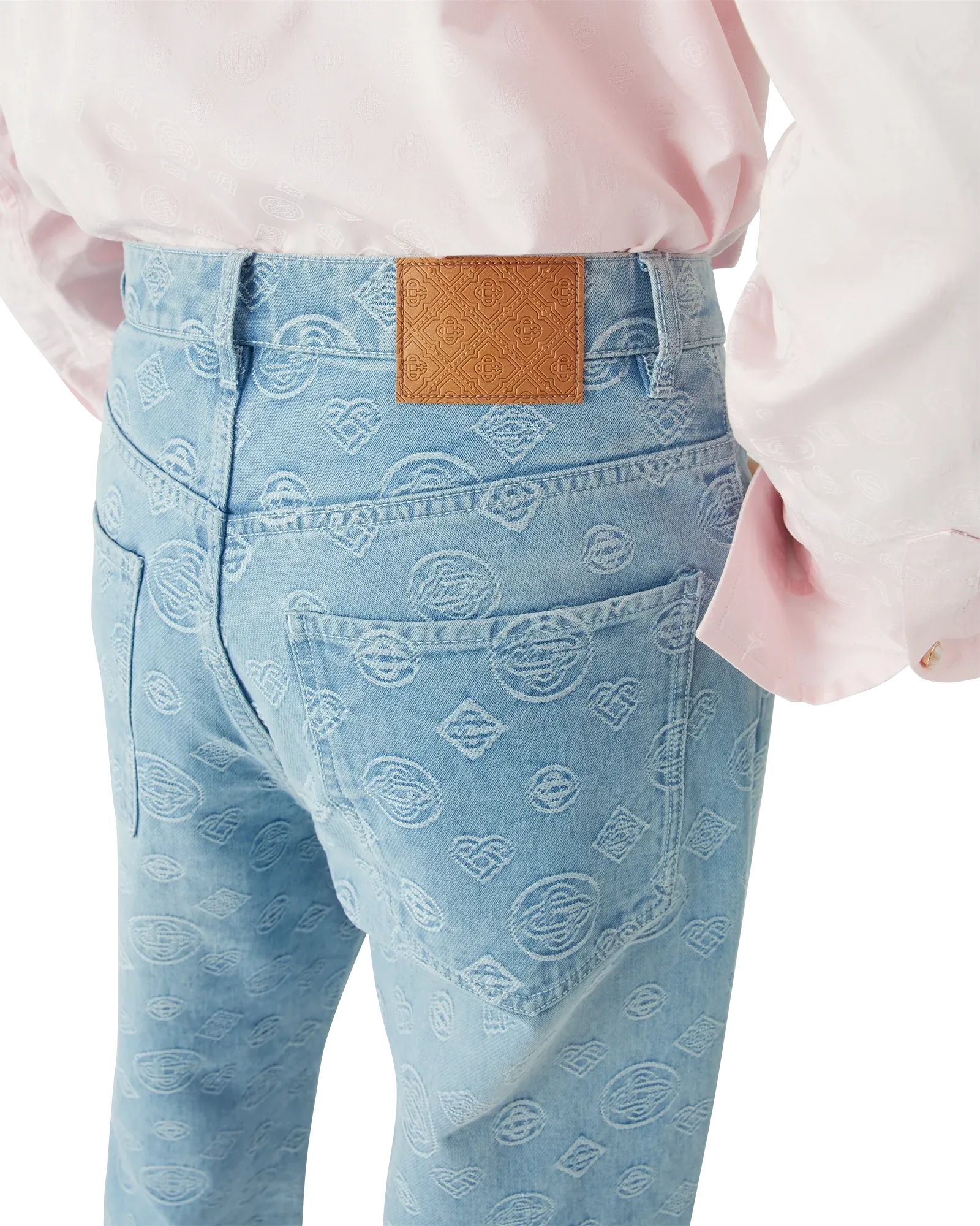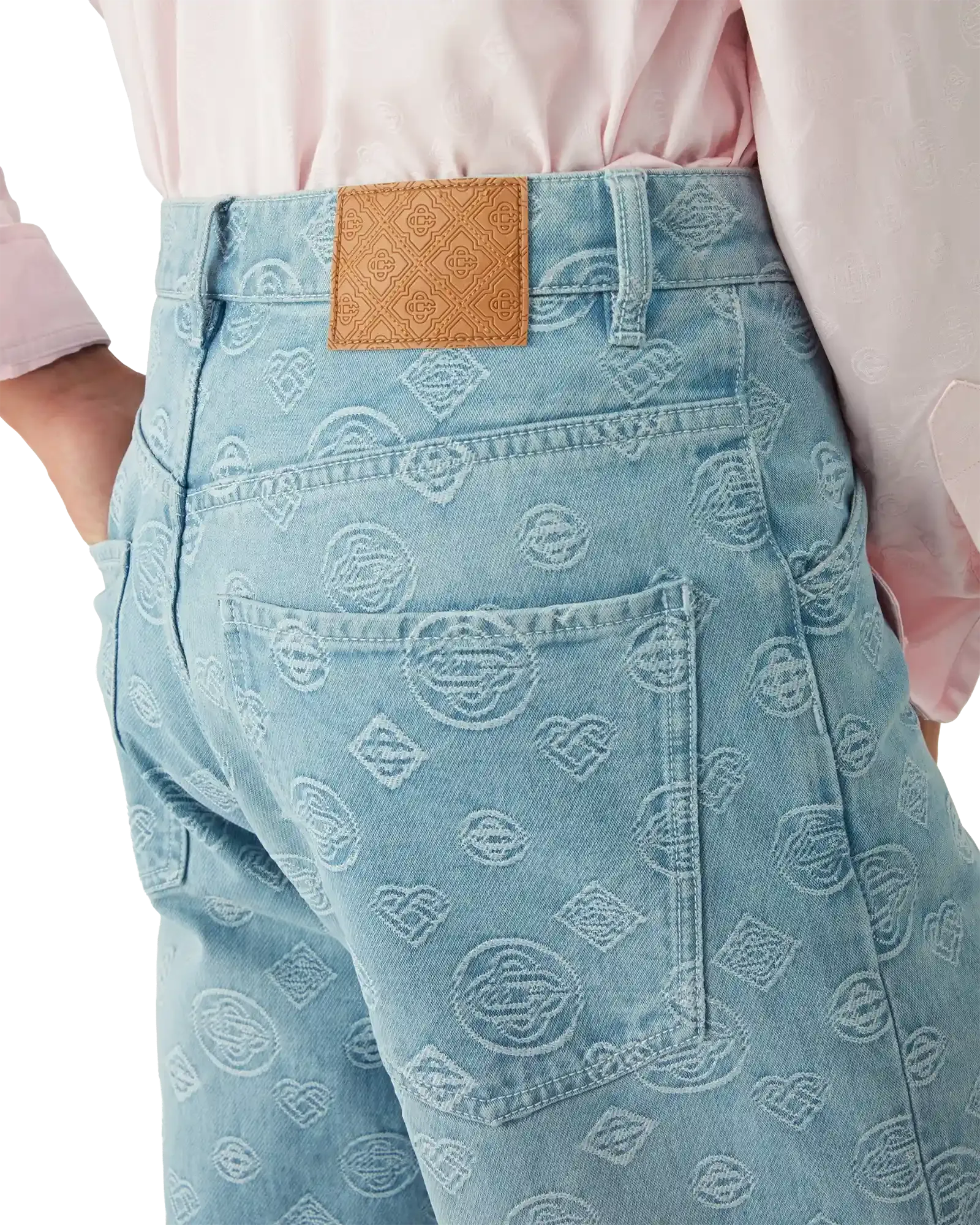 The Blue Denim Monogram Relaxed Fit Jeans combine classic straight-leg tailoring with a bold all-over Honeydew logo repeat, designed from unique shapes for a distinctive pattern. Crafted in Portugal from 100% cotton denim, the jeans feature belt loops, a zip fly, slanted front pockets, and back patch pockets. Gold-plated hardware adds a refined finish, while the relaxed fit ensures comfort and versatile styling for everyday wear.