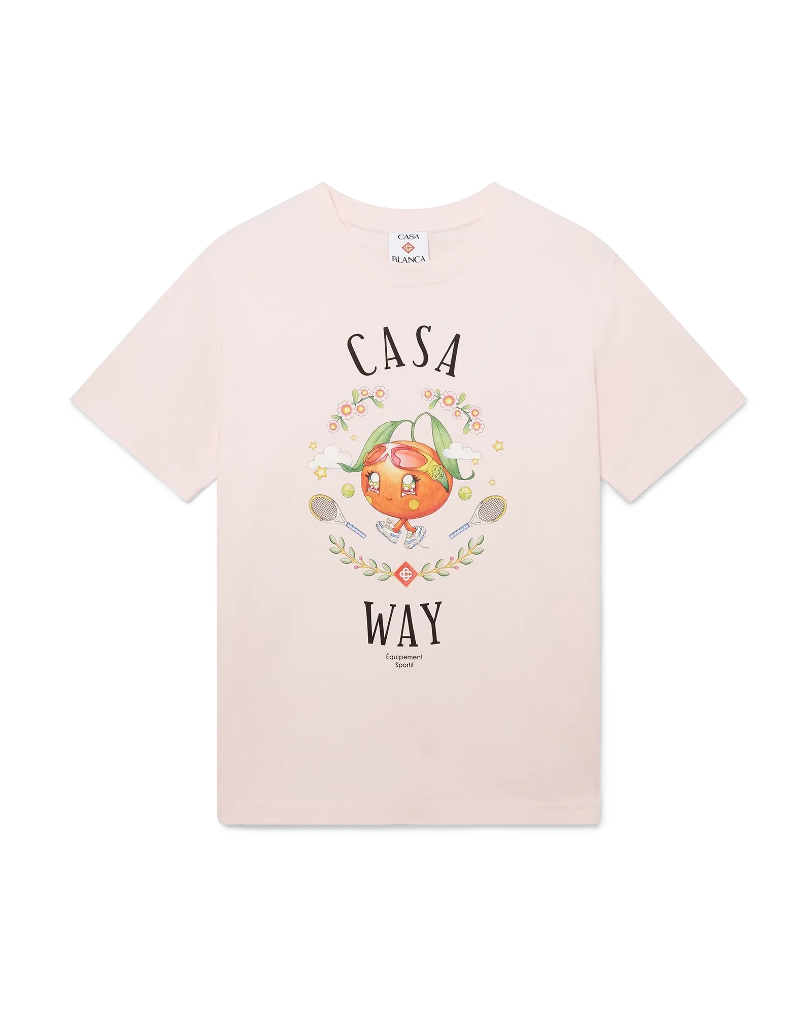 The Casa Way Orange Mascot Short Sleeve T-Shirt is a playful printed design featuring the Kawaii Orange character, a central figure in the Casablanca universe. Styled with Casa accessories, glasses, and sneakers, this seasonal artwork adds a whimsical yet stylish touch to the piece. Crafted from 100% organic cotton in a pale pink shade, the t-shirt is finished with a classic crew neck and designed for a relaxed fit, offering both comfort and creativity.