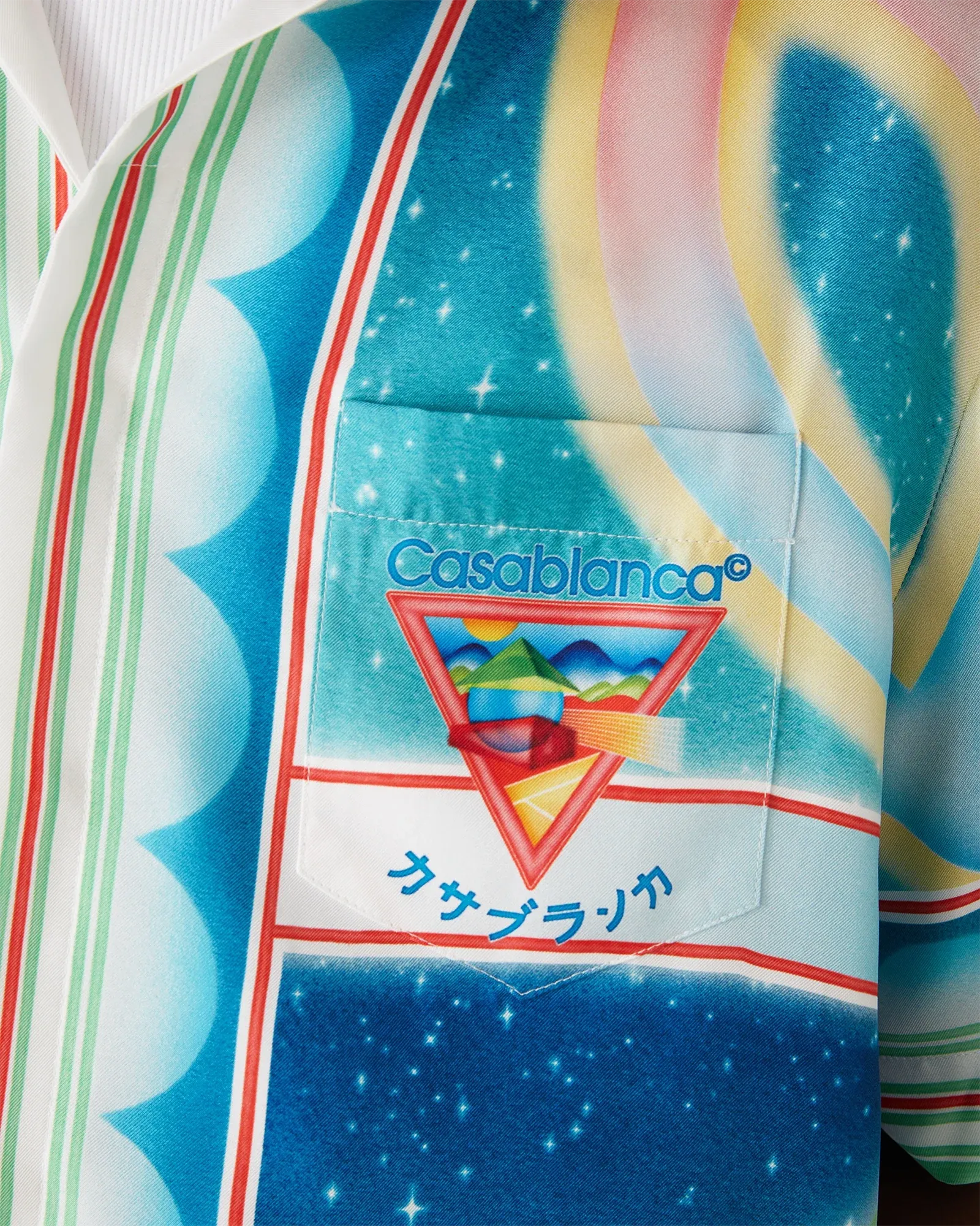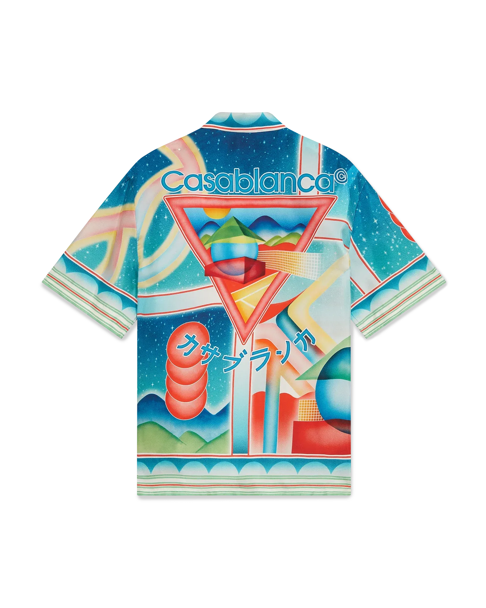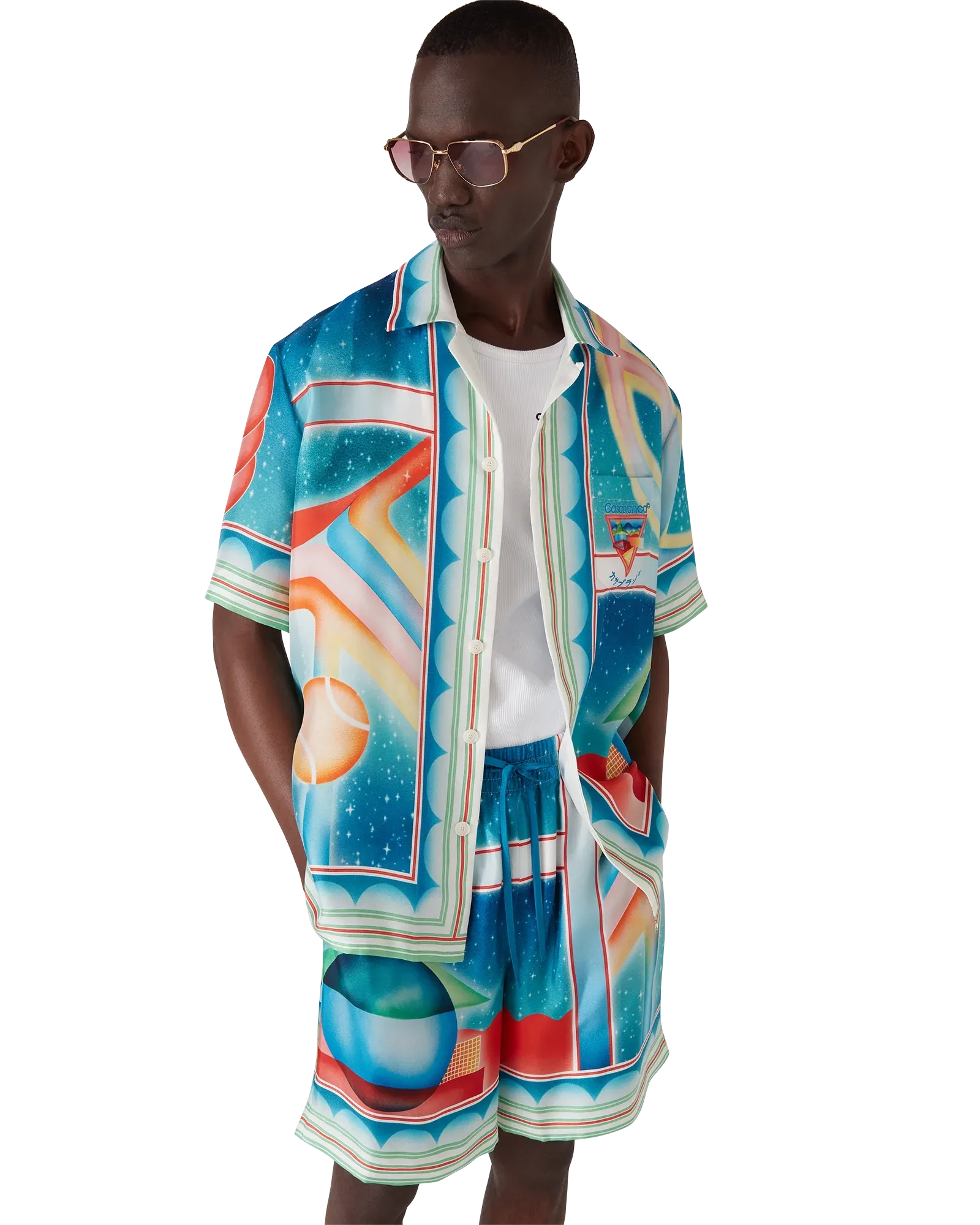 The Galaxy Court Short Sleeve Silk Shirt showcases Casablanca’s refined artistry with an all-over print inspired by nature, architecture, and tennis. Crafted from luxurious silk twill fabric, the design embodies the brand’s signature aesthetic while offering a relaxed and elegant fit. Finished with a Cuban collar, hidden button closure, interlocking CC corozo buttons, and stripe edge detailing on the collar, cuffs, and hem, this shirt seamlessly blends timeless sophistication with a contemporary edge.