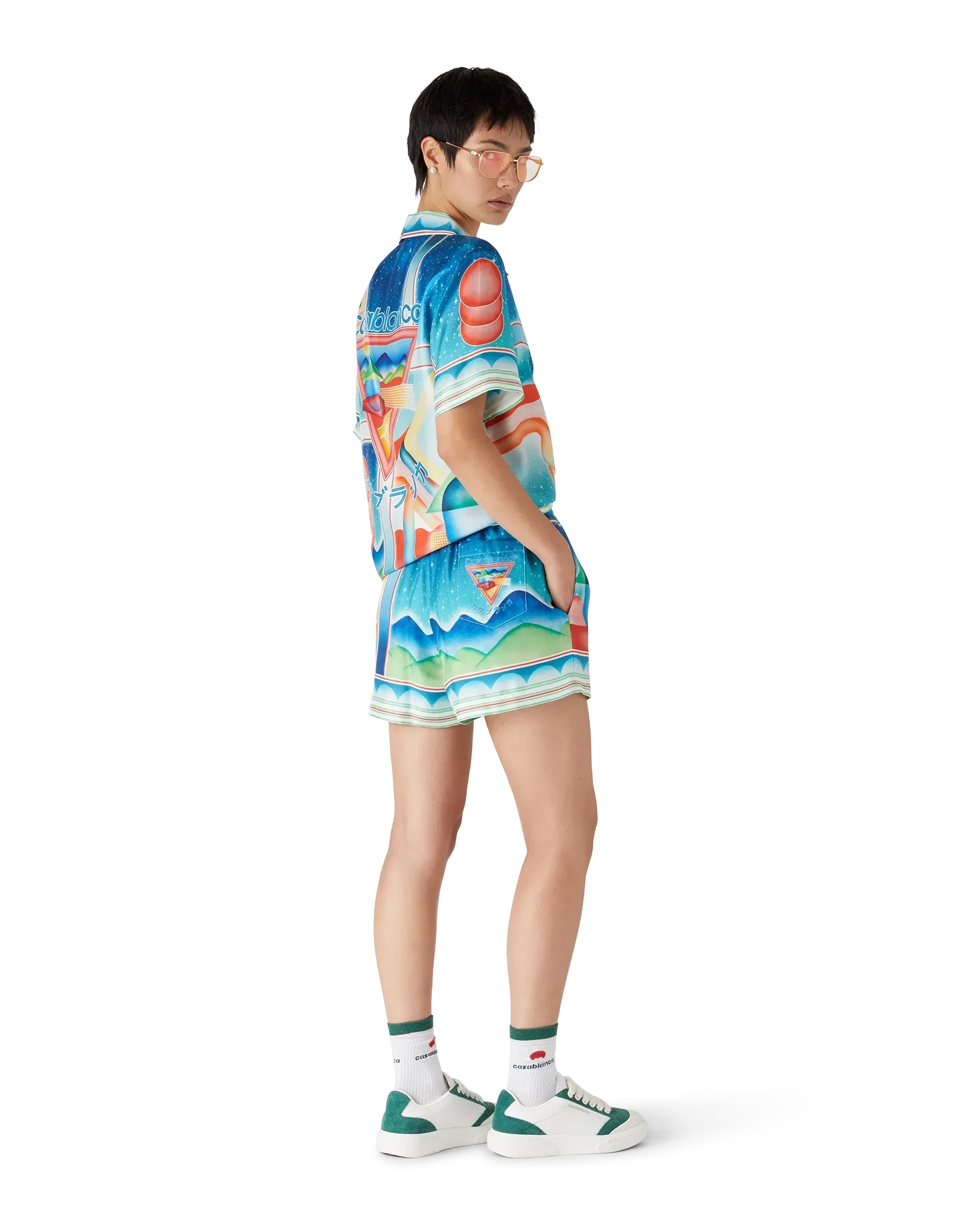 The Galaxy Court Silk Shorts by Casablanca are crafted from luxurious silk twill with a vibrant all-over multicolour print. Designed for a relaxed fit, these Casablanca shorts feature an elasticated waistband with drawstring fastening, in-seam side pockets, a back pocket, and a smooth lining for comfort. Made in Italy, they combine effortless style with premium craftsmanship.