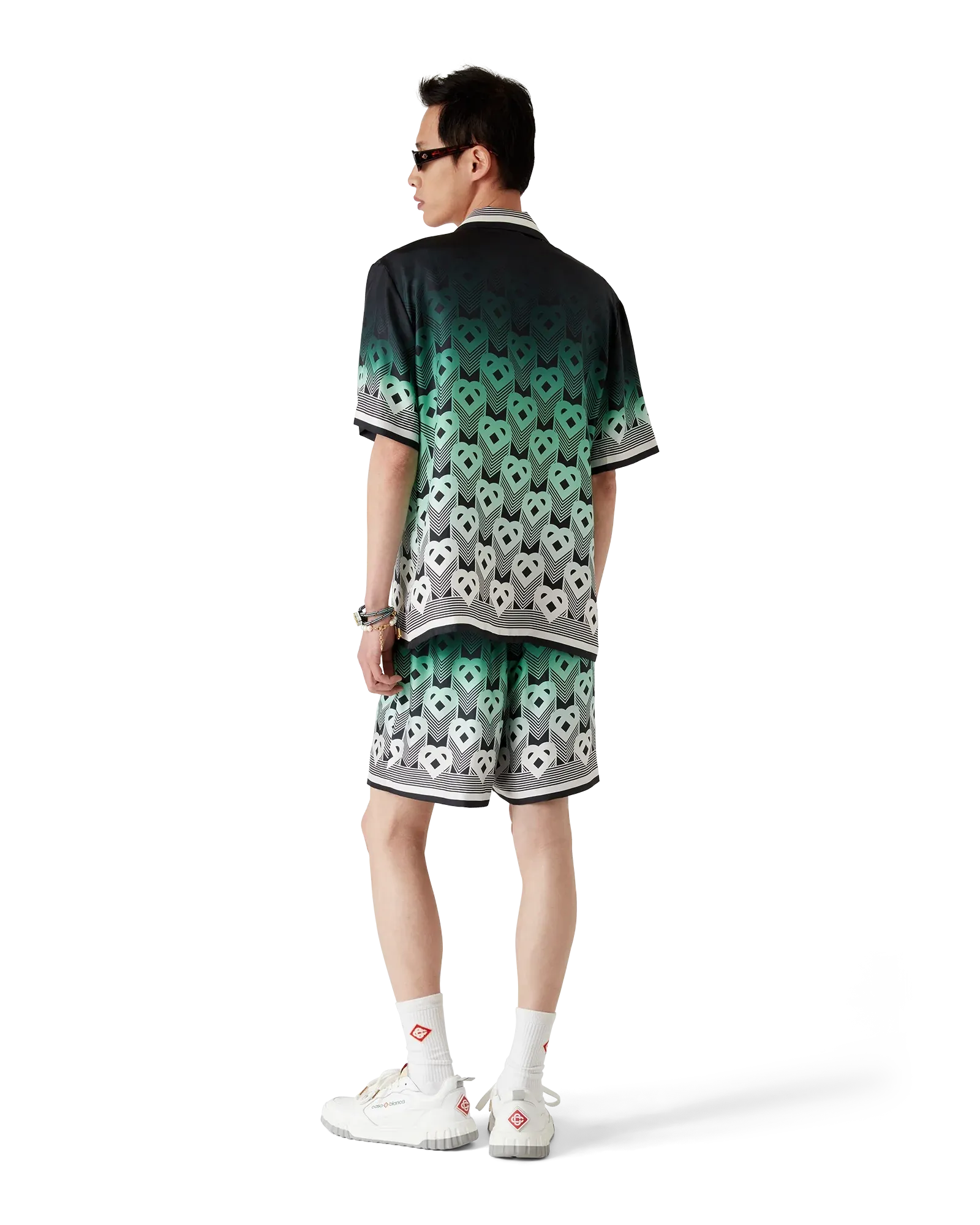 The Gradient Monogram Short Sleeve Silk Shirt is a standout printed design featuring the house’s signature heart monogram set against a mint gradient, inspired by the Park Hyatt Tokyo’s iconic interiors in mint and black. Crafted from premium silk twill fabric, this shirt blends modern artistry with timeless craftsmanship. Finished with a Cuban collar, breast pocket, hidden button closure, interlocking CC logo corozo buttons, and stripe edge detailing on the collar, cuffs, placket, and hem, it embodies relaxed elegance with a contemporary edge.