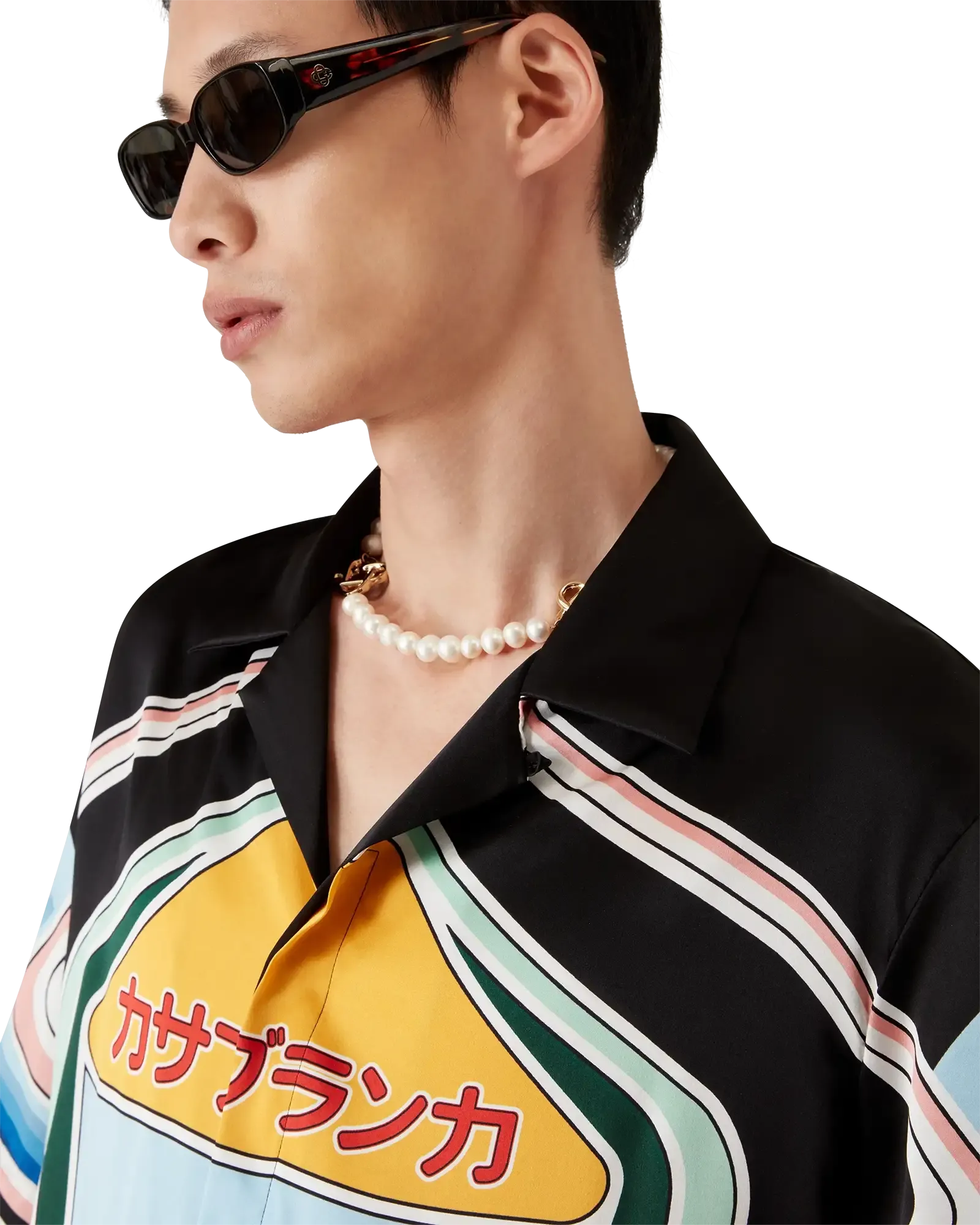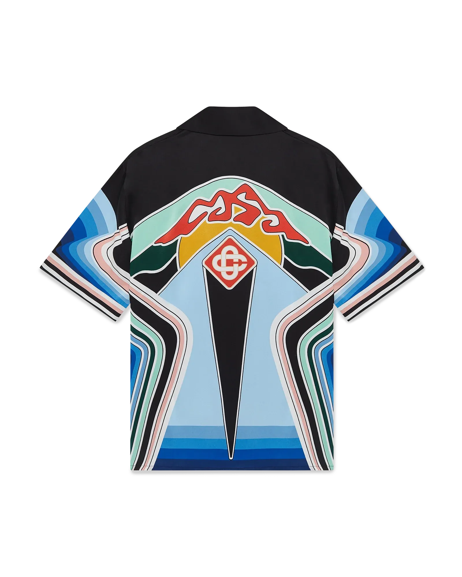 The Graphic Mountain Short Sleeve Silk Shirt is a standout design that highlights Casablanca’s evolving iconography style. Featuring a digitally built artwork of the house’s mountain logo, this all-over printed silk satin shirt showcases gradients and bold lines that emphasize strong branding while maintaining artistic elegance. Crafted in Italy, it is finished with a hidden button closure, interlocking CC corozo buttons, and the house’s signature diamond logo, offering a modern yet timeless look.