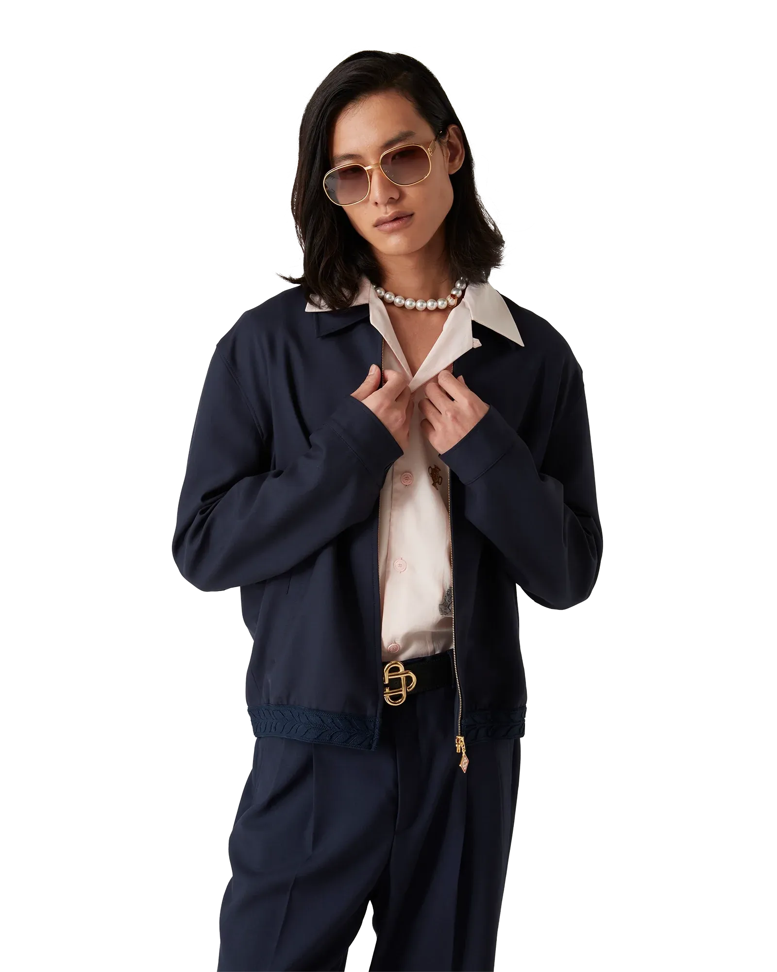 The Casablanca Wool Sports Tailoring Jacket blends classic tailoring with modern functionality. Crafted from 100% virgin wool, this versatile piece is designed for a timeless fit and refined comfort. The jacket features a peak collar, a front zip closure with the house’s signature diamond monogram zipper tab, and vertical welt side pockets for a sleek finish. Elasticated cuffs add a subtle sporty edge, while the viscose-cotton lining ensures a smooth, breathable feel. Made in Hungary, this navy jacket captures the essence of elevated sports tailoring—perfect for smart casual and sophisticated everyday styling.